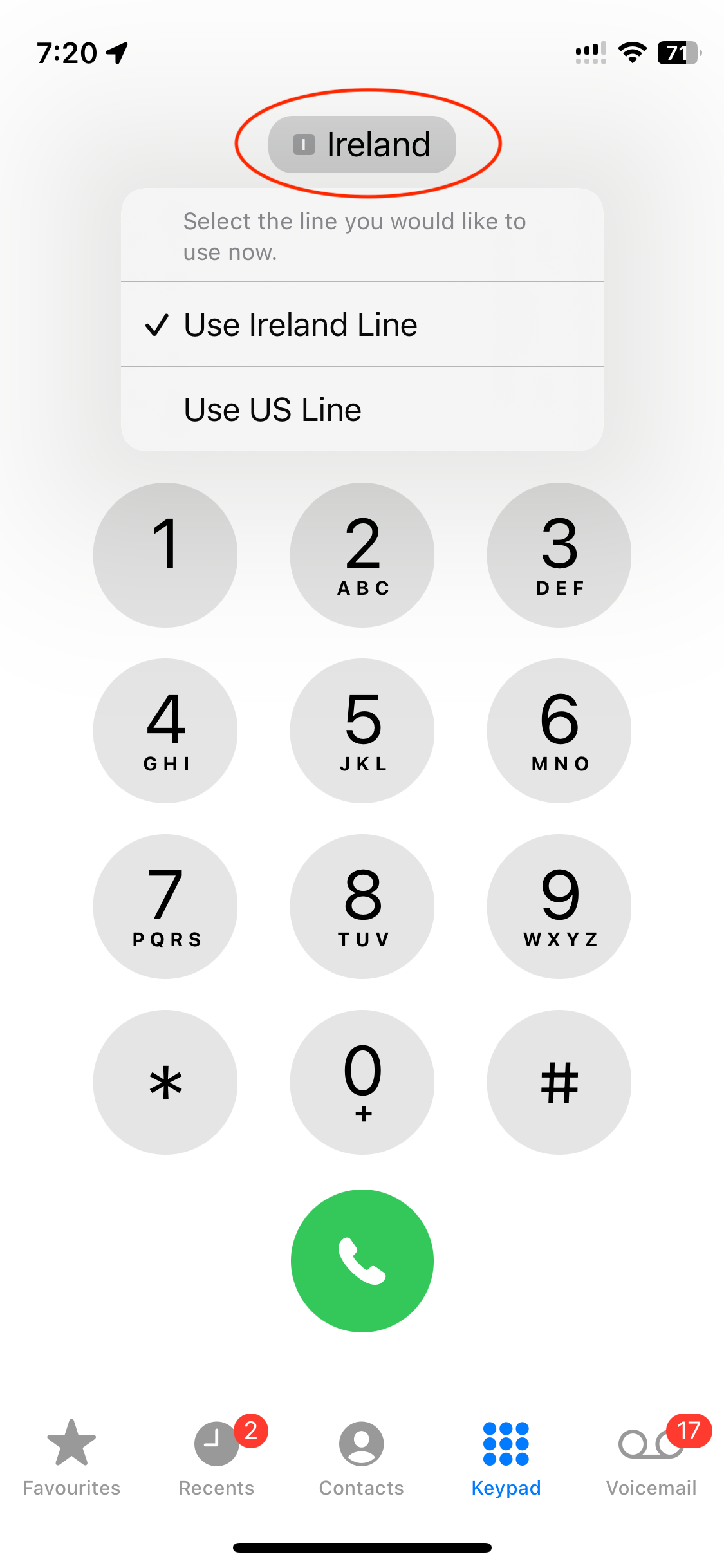 I’ve labeled my two lines “Ireland” and “US” (I find this easier to keep track of than “Primary” that was suggested on the phone).