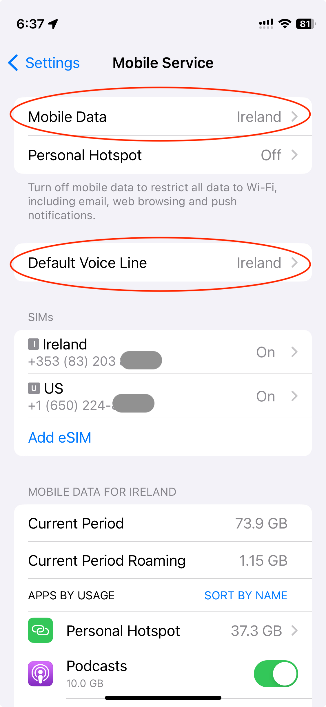 In there, be sure to select your Irish (local) line for “Mobile Data” (this assumes you have unlimited data on your local line). You don’t want to be paying for roaming data on your US line, the rates are usually outrageous!